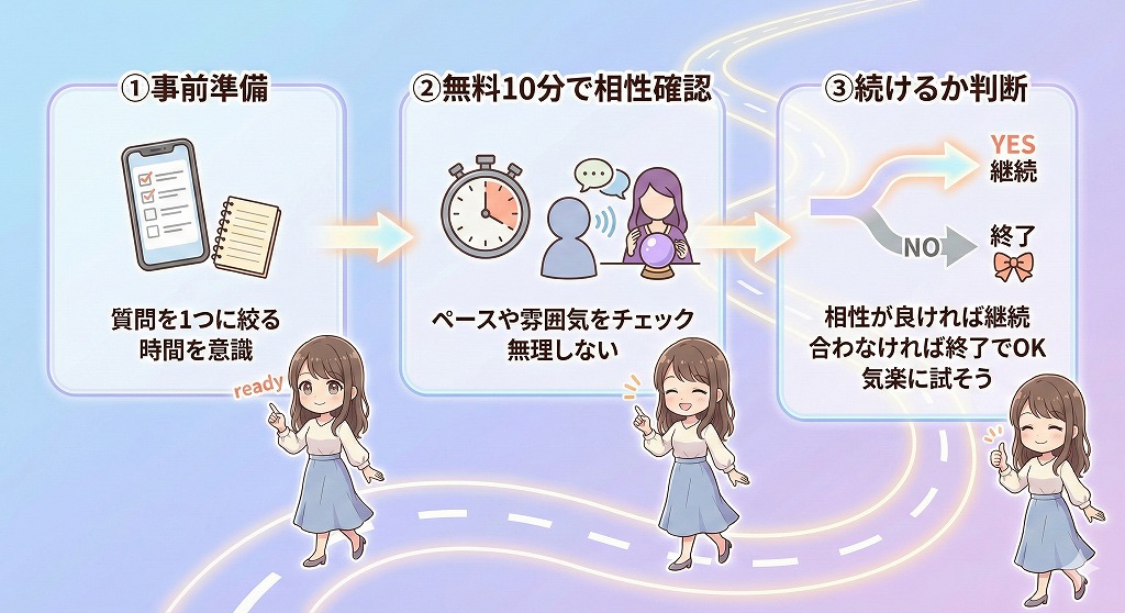 初回10分無料の時間は、未来を決めてもらうためというよりも、占い師との相性を確かめるために使うのがおすすめです。