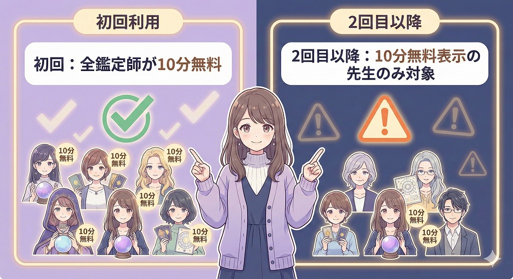 一方で、2回目以降の10分無料は、全ての鑑定師に適用されるわけではありません。