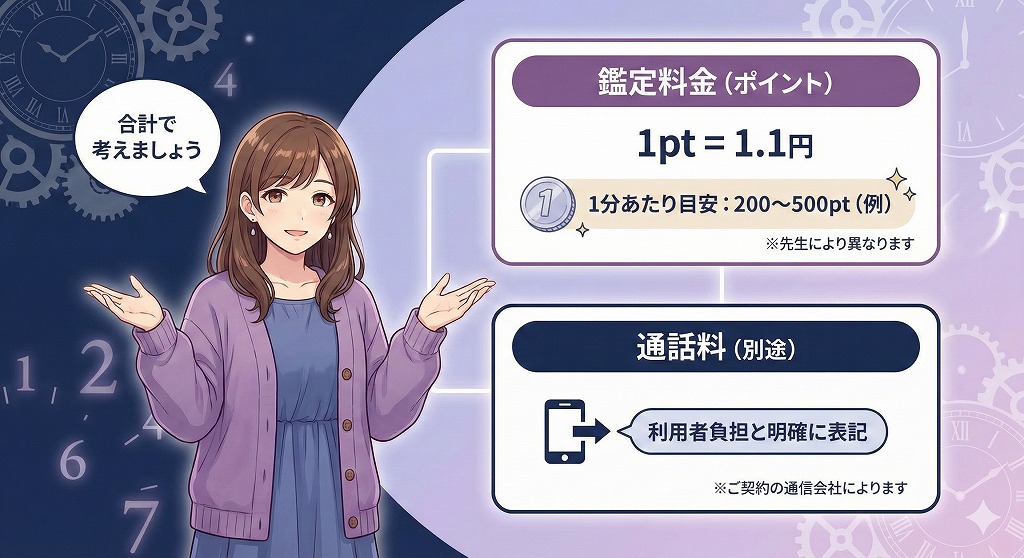 料金は1pt1.1円を基準に、1分あたりの単価と通話料を合わせて考えることが大切です。