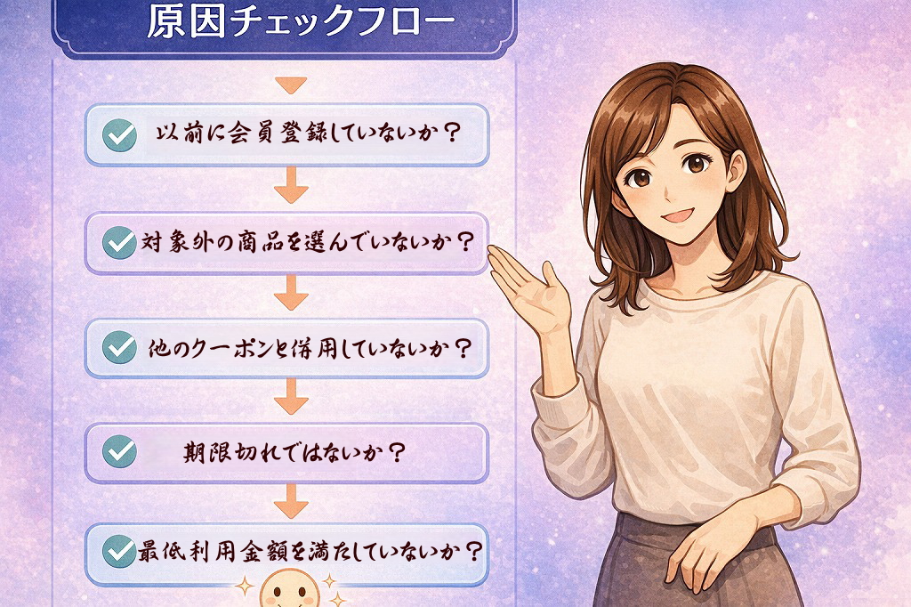 また、クーポンコードの入力ミスも見落とされがちな原因の一つです。