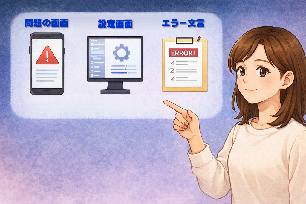 その際、どの画面で止まっているのか、エラーメッセージが出ているかを整理して伝えると対応がスムーズになります。