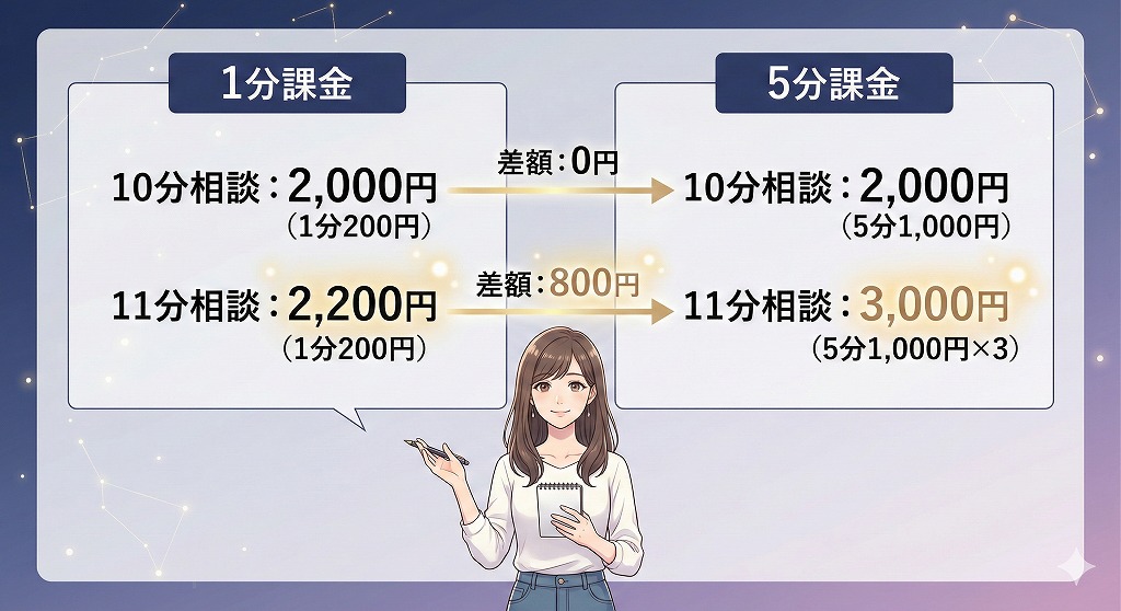 課金単位が1分か5分かで同じ10分相談でも差が出る