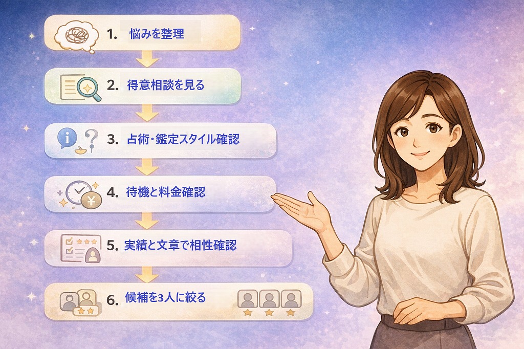 得意相談や占術、鑑定スタイルだけでなく、待機パターンや料金、実績、文章の雰囲気まで含めて読むことが大切です。