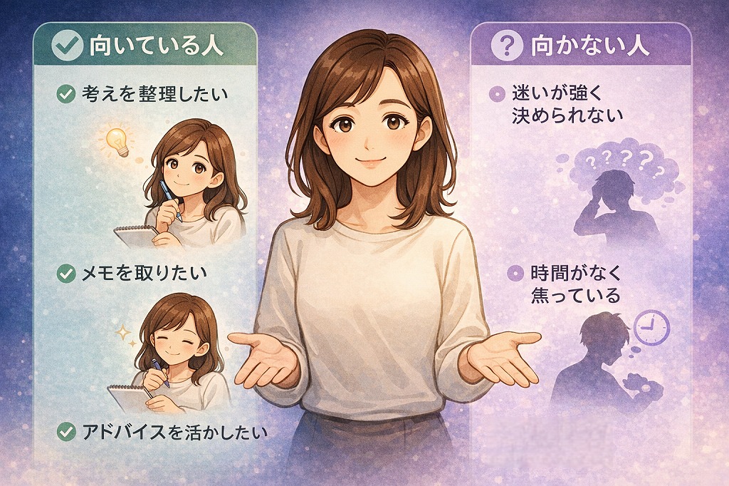向いているのは、占い師との対話を通じて気持ちを整理したい人や、恋愛や人間関係について考えるヒントが欲しい人です。