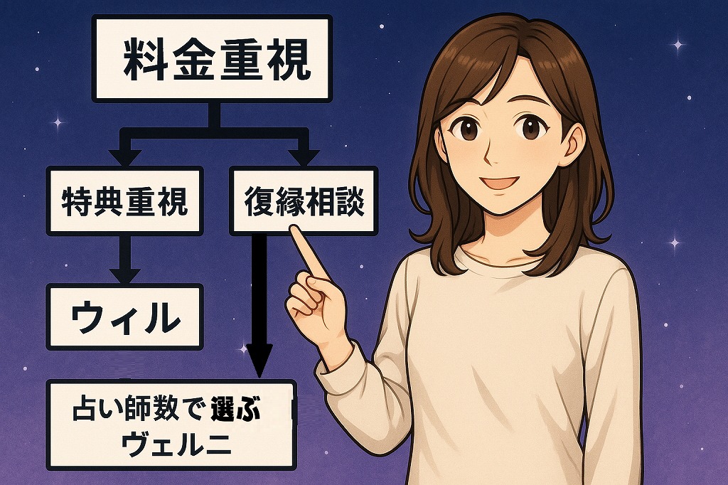 - ヴェルニは初回特典が充実(最大10,000円分無料)し、復縁・恋愛相談に強い傾向